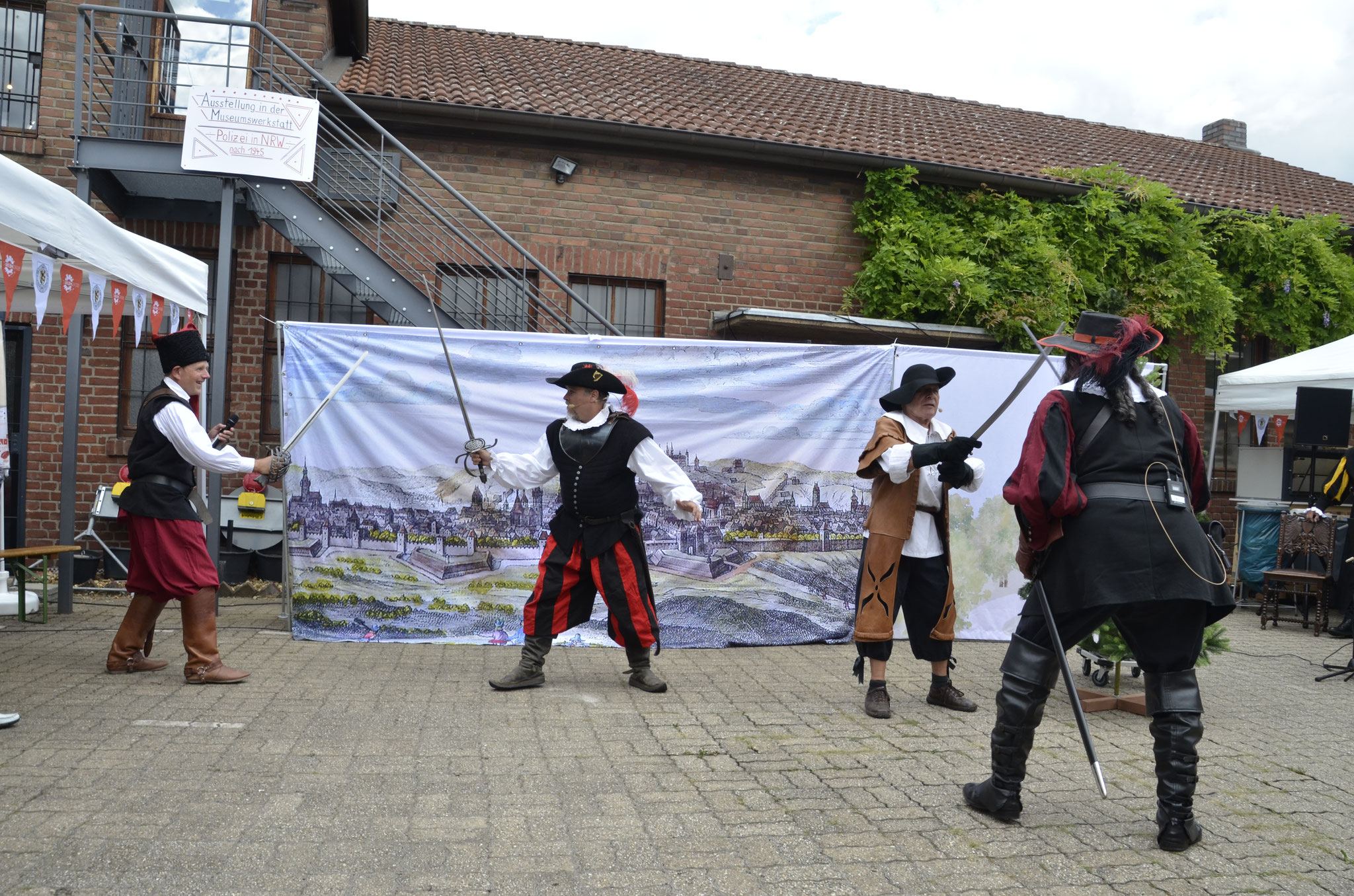 Anschließend veranstaltete Machuj ein kleines Quiz mit den Zuschauern. Hier wurde festgehalten, welche Informationen aus dem Stück mit historischen Quellen zu belegen sind und welche Teile frei der Phantasie entsprachen. Zwei weitere Kurzvorträge rundeten die Veranstaltung ab. Markus Potes, der seit Jahren in der Rolle des Jan brilliert, berichtete über die Jülicher Landdragoner (Vorgänger der heutigen Polizei), die übrigens auch in Bergheim stationiert waren und fast die gleiche Uniform trugen wie die heutige KG Bergheimer Torwache. Thomas Irlenbusch erschien dann in der Kleidung eines Soldaten im 30-jährigen Krieg. Der Fachmann für historische Waffenkunde im Museumsverein präsentierte zeitgenössische Schießwaffen und deren Entwicklung.
