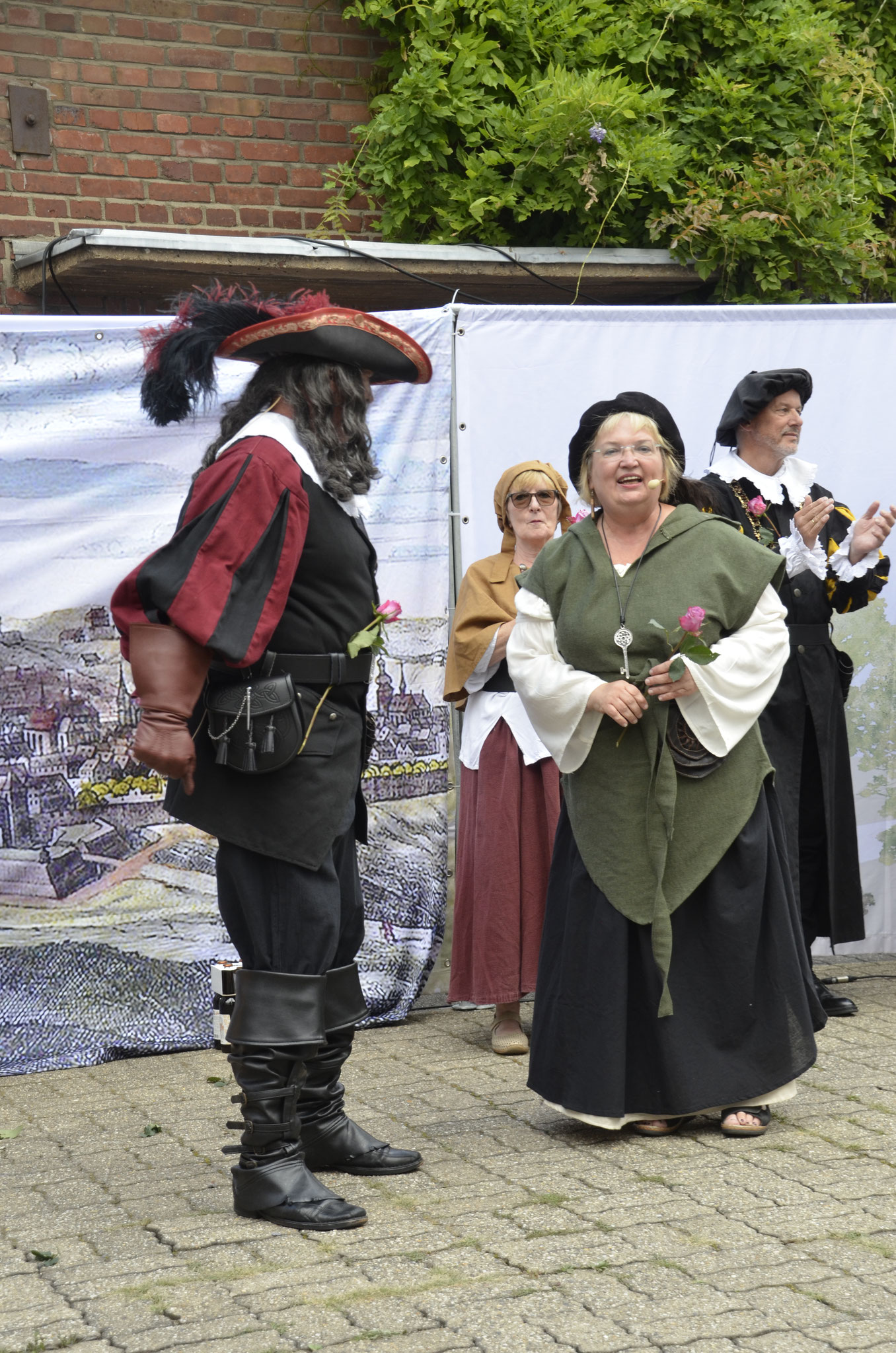 Wenig später startete das Historienspiel im Innenhof. Auch hier war es so voll wie noch nie. Sogar auf dem Parkplatz des Nachbargrundstückes standen die Besucher. Diesmal wurden die Zuschauer direkt in das Jahr 1642 mitten in den 30-jährigen Krieg versetzt. Nicht nur die Knechte und Mägde auf Schlenderhan, wo Jan von Werth einst Reiterknecht war, hatten Hunger. Ganz Bergheim litt durch die Einquartierung eines Heeres aus französischen, hessischen und weimarischen Truppen. Umso mehr freute sich Griet über den Besuch von Jan von Werth (Markus Potes), anlässlich der Verlobung seines Töchterchens Lambertine (Michaela Schmidt) mit dem Sohn seines einstigen Dienstherrn Frentz (Thomas Irlenbusch).