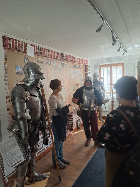 und Thomas Irlenbusch informierte über seine Rittersammlung und zum Thema Ehrenstrafe. Machuj führte dann als Magd Brunhilde durch die Mittelalterausstellung zum Thema Schlösser und Burgen. Es